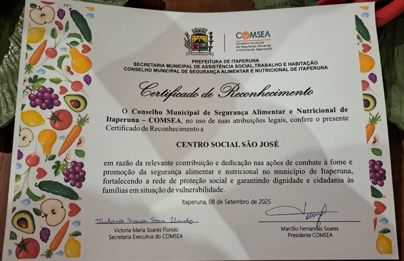 Ontem à noite, o Centro Social São José recebeu da Prefeitura de Itaperuna, por meio da Secretaria Municipal de Assistência Social, Trabalho e Habitação e do Conselho Municipal de Segurança Alimentar e Nutricional de Itaperuna, o Certificado de Reconhecimento pela relevante contribuição e dedicação nas ações de combate à fome e de promoção da segurança alimentar e nutricional em nossa comunidade.